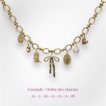 Pour définir l’ordre de vos charms, ajoutez votre sélection de charms à votre panier – validez la commande – dans “Notes de commande” écrivez les numéros des charms choisit dans l’ordre que vous souhaitez qu’ils soient placés, du plus à gauche au plus à droite, ex photo : 15 – 3 – 16 – 11 – 13 – 9 – 18